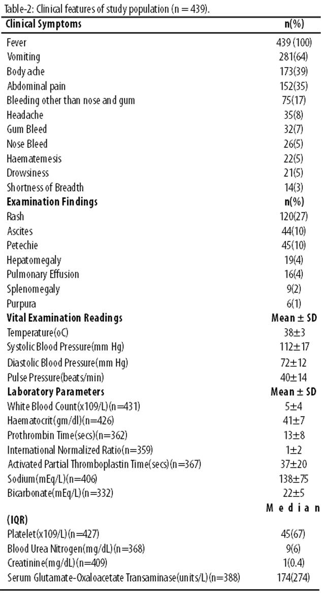 All the patients presented with fever (100%), vomiting 281 (64%) and body ache 173 (39%). Rash (27%), petechiae (10%) and purpura (1%) were present in less number of patients.