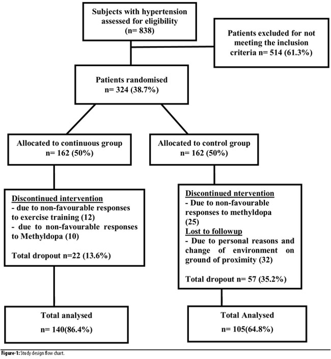Of the total, 245 (75.61%) subjects (140 [57.1%] from the cases, and 105 [42.9%] from the controls) completed the 8-week training programme, while 79 (24.38%) subjects (22 [27.8%] from cases, and 57 [72.2]) from controls) dropped out because of non-compliance, unfavourable responses to methyldopa and exercise training or incomplete data. The data of 245 subjects, as such, was used in the statistical analysis (Figure-1).