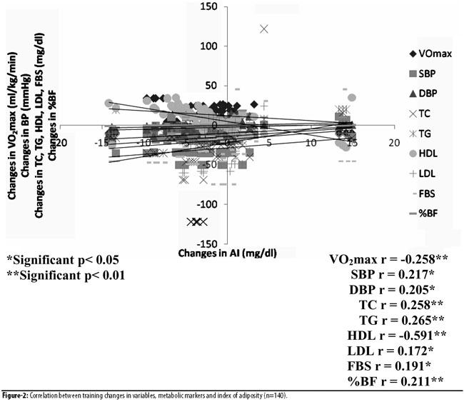 Results indicated significant correlation between baseline VO2max and other variables such as: SBP (r= 0.143); DBP (r= 0.133); %BF (r= 0.128); TC (r= 0.228); TG (r= 0.157); HDL (r= 0.162); LDL (r= 0.322) and AI (r= 0.477). Training changes in VO2max significantly correlated with training changes in other parameters such as: SBP (r= -0.268); DBP (r= -0.237); %BF (r= -0.212); BMI (r= -0.247); WHR (r= -0.247); FBS(r= -0.170); TC (r= -211); TG (r= -0.297); HDL (r= 0.190); LDL (r= -0.173) and AI (r= -0.258). Training changes in AI significantly correlated with training changes in other parameters such as: VO2max, SBP, DBP, %BF, FBS, TC, TG, HDL and LDL at p< 0.05 and p< 0.01 (Figure-2).