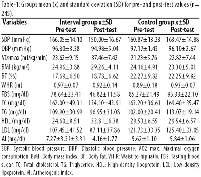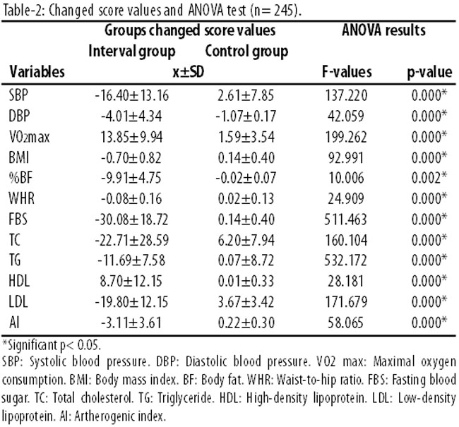 Results: The study had 140 (57.1%) cases with a mean age of 58.90±7.35 years, and 105 (42.9%) controls with a mean age of 58.27±6.24 years. It revealed significant increased effect of interval training programme on maximal oxygen consumption and high-density lipoprotein. There was significant reduction in on all the other controls. Changes in maximal oxygen consumption as a result of interval training significantly and negatively correlated with the other variables except high-density lipoprotein.