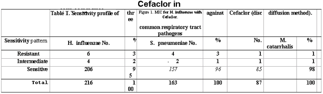 Conclusion:Resistance of respiratory tract pathogens to the 2nd generation Cephalosponn, Cefaclor is very low. MIC 90 of Cefaclor against all three common respiratory tract pathogens is < 2 ug , which indicates that Cefaclor would be effective in more than 90% of cases infected with these bacteria (JPMA 52:7,2002).