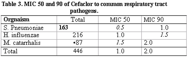 Result:Of the 163 Streptococcus pneumoniae, 87 Moraxella catarrhalis and 216 Haemophilus influenzae > 95% isolates were susceptible to Cefaclor. The MIC 90 of all these pathogens were <2 ug.