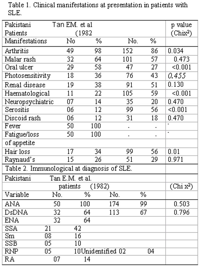 Comparison of clinical and laboratory features was made between our patients and those studied by Tan EM. et al. subcommittee 1982. The total number of patients included by Tan EM et al in the study was n=17 7. Statistical method applied to find out any significant difference between our population and the control group was Chi square test.