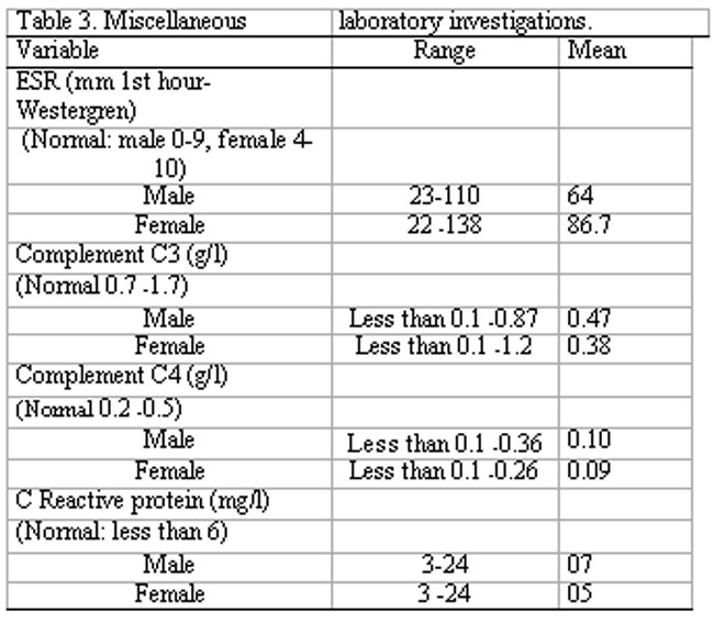 Other important laboratory fmdings included a raised ESR, decrease in both complement C3 and C4 levels and a disproportionately low (as compared to ESR) or normal C reactive protein levels (Table 3).