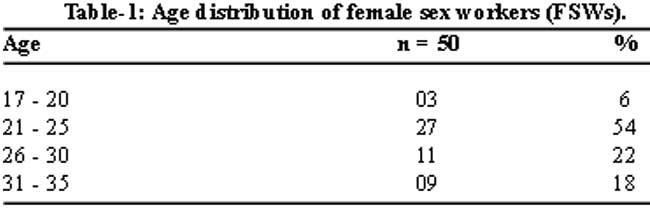 A total of fifty female sex workers (FSWs) were screened for syphilis with a mean age of 26.2 ± 4.4 years. The frequency, percentage and age range of these subjects is mentioned in Table-1.