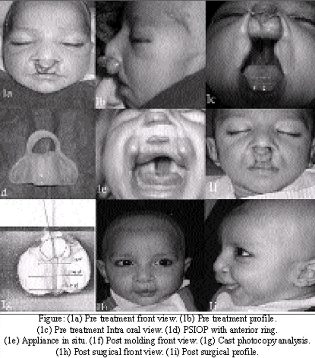 Since then a number of active and passive appliances have been reported in the literature. The appliances used to align the protruding premaxilla include intraoral appliances9-11 and combination of intraoral and extraoral appliances.7,12-15 Santiago et al14 demonstrated that the use of pre-surgical infant orthopaedic plate prior to initial lip repair helps in achieving alignment of premaxillary segment and elongation of the columella attributing to increased nasolabial mucosal lining surface area. Grayson and Cutting16 described that the pre-surgical nasoalveolar molding and pre-maxillary alignment are known to facilitate initial surgical repair and reduce post surgical scarring. During the initial 2 to 3 months of life the plasticity of cartilage and mouldability of the alveolar bone segments especially the premaxilla is high that helps in achieving premaxillary retraction, derotation and approximation of the cleft alveolar segments. This high plasticity is due to the high levels of hyaluronic acid, a component of the proteoglycan intercellular matrix17 and maternal oestrogen circulating in the neonates. 16