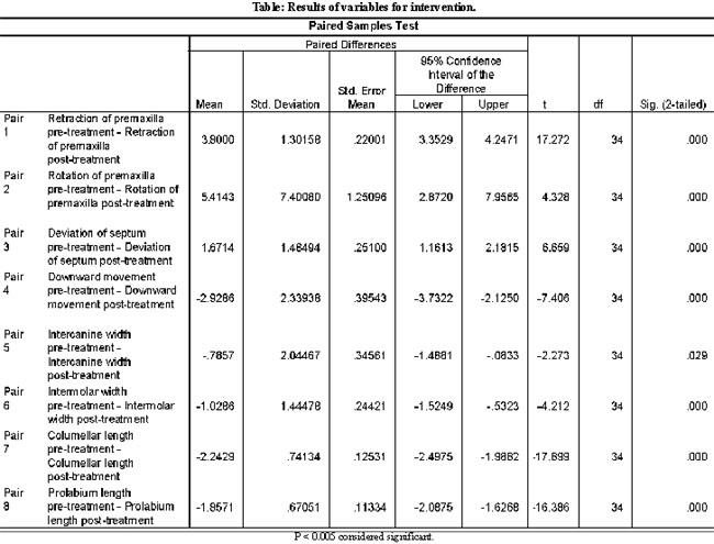 Results: The results showed highly significant (<.005) difference between the pre and post treatment records of variables except the intercanine distance where the results are significant i.e. (< 0.05).