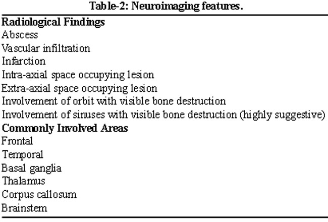 Classically, craniocerebral aspergillosis should be considered in any patient known or suspected to be immunocompromised, presenting with signs, symptoms and radiological features suggestive of a space-occupying lesion with or without preceding history of nasal blockade and/or discharge. Multiple authors have described a variety of presenting symptoms such as nasal stuffiness, headache, peri-orbital pain, vomiting, convulsions, hemiparesis, cranial nerve deficits (diplopia/ anosmia), proptosis, sensory impairment, dysarthria, lethargy, impaired consciousness, seizures, fever, and rarely, ear discharge.8 In patients with paranasal sinus disease, orbital extension with proptosis, ophthalmoplegia, visual deterioration (which may lead to total monocular blindness), and chemosis may occur. There are various clinical syndromes associated with fungal infections of the CNS and can involve most part of the neuroaxis.9 These largely depend on the pathological reaction elicited by the fungus in the host which varies with the virulence of the organism, the antigen makeup of the species and the immune status of the host. They can occur alone or in combination and comprise of meningitis, intracranial mass lesions, skull-base syndrome, rhinocerebral syndrome, stroke syndrome and spinal syndrome. Skull-base syndromes include orbital apex syndrome, cavernous sinus syndrome, proptosis with or without ocular palsy, polyneuritis cranialis and orbito-cranial syndromes. In one study of patients suffering from CNS aspergillosis, 64 out of 89 patients presented with skull base syndromes.10 The disease is usually slowly progressive and symptoms may persist for months. Alternatively, patients may also present acutely with cerebral infarctions or haemorrhage, a relatively uncommon manifestation of vascular invasion of the fungus.11 Stroke may also be due to Aspergillus endocarditis leading to embolic stroke.10