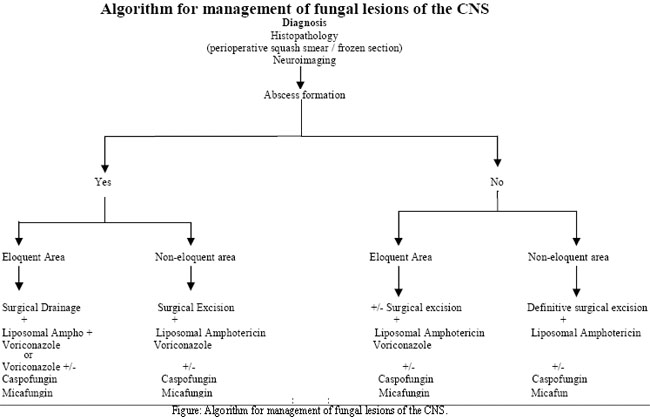 There are no specific treatment recommendations for intracranial aspergillosis, as detailed data on patient survival is only available from case reports and case series.26,27 However, despite newer, safer and more effective anti-fungal medications, the consensus is that the cornerstone of treatment remains surgical excision, a standard based largely on reports of personal experience; and more recently on the basis of a multifactorial risk analysis done by Schwartz et al on the data of a study population comprising mainly of immunocompromised patients on voriconazole therapy, which suggested improved outcomes in patients who had undergone neurosurgical intervention.27 Besides, there are very few reports of patients surviving CNS aspergillosis on medical treatment alone. It cannot be over emphasized that surgical excision must always be followed by aggressive antifungal chemotherapy to achieve best response.7