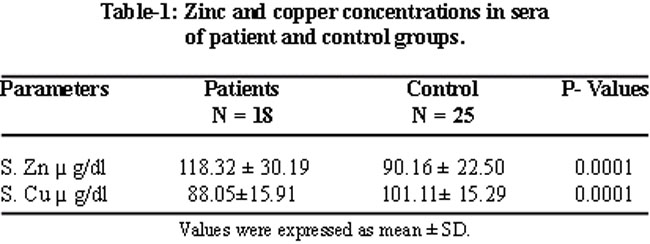 Mean values of zinc and copper concentrations in sera of patients were 124.33 ± 30.04mg/dl and 88.05 ± 15.91mg/dl respectively in comparing with those of the control group there was a significant difference (P<0.0001) (Table-1).