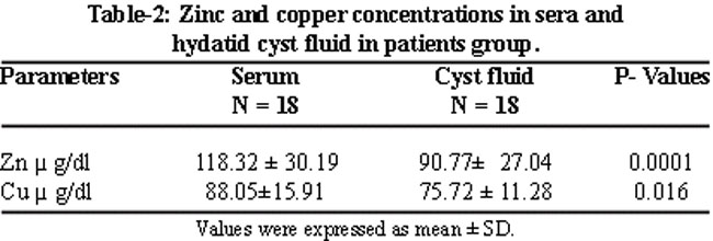 On the other hand, mean values of both zinc and copper levels in sera of patients were lower than those of the hydatid cyst fluids which were statistically significant (Table-2).