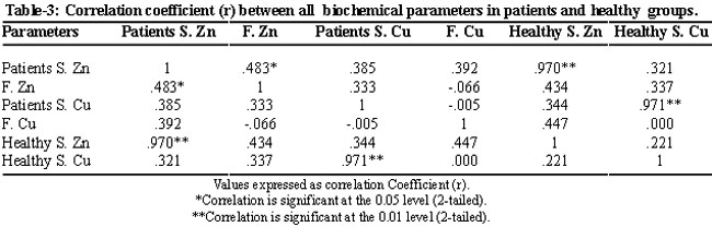 There was a positive correlation between sera zinc and copper concentrations of patients and the control group while negative correlations were observed with other relationships as expressed in Table-3.