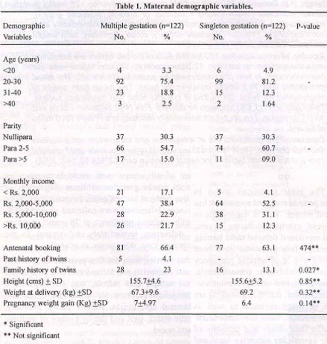 The incidence of multiple gestations varies in different parts of the world. In the developed countries it has increased during the past 20 years. This is mainly due to widespread availability of ovulation inducing agents, assisted reproduction techniques and delayed child bearing by women1. Traditionally, multiple gestations have been associatcd with increased incidence of adverse pregnancy outcomes including premature delivery, pre-eclarnpsia, respiratory distress syndrome and mal-presentations. Compared to singleton pregnancies, multiple gestations are said to be associated with higher perinatal as well as maternal morbidity and mortality2,3. There is notable dearth of reliable data regarding the incidence and outcome of multiple gestations in Pakistan. After extensive local and international literature search only three original4-6 and one review article7 were retrieved dealing with this problem in Pakistan. Thus to determine the prevalence of multiple gestations and compare the maternal and perinatal complications with singleton gestations, a prospective case controlled observational study was undertaken at MCH Centre PIMS. The acquisition of this data would also assist in counseling patients with multiple gestation of the outcome figures at this tertiary care centre.
