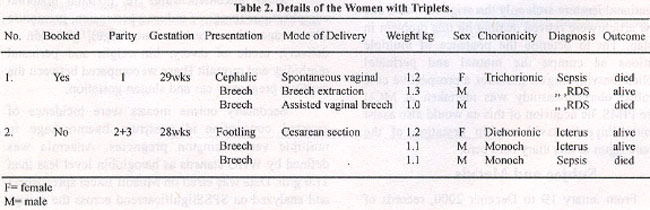 Unlike the data from developed world8, where more than one third of multiple pregnancies are associated with assisted conception and ovulation induction, the present study has only 0.81% of multiple gestations associated with the use of clomiphene citrate. The availability of assisted conception technologies is limited in the developing countries and the cost is prohibitively high for the common man. Our reported incidence of twinning of I in 57 is not dissimilar from I in 69 reported from Sir Ganga Ram Hospital, Lahore in 1996 and thus indicates the naturally occurring incidence of multiple gestation in the population presenting at the MCH Centre9.