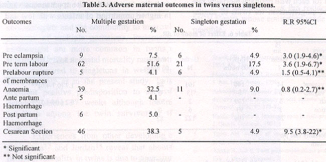 Main outcome measures were, prenatal maternal complications (pregnancy induced hypertension, premature labour, anaemia, antepartum haemorrhage), gestation at delivery, mode of delivery, birth weight and perinatal morbidity and mortality. These were compared between the multiple pregnancy cases and singleton gestation.