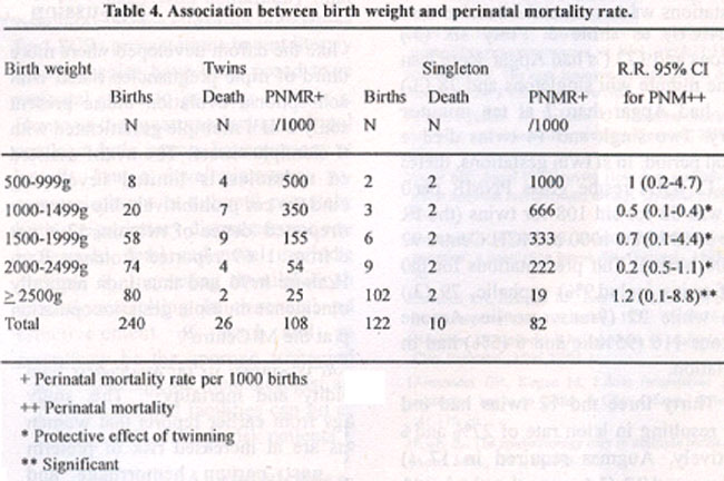 This shows that for each weight group the perinatal mortality rate (PNMR) of singletons is higher than for twins of similar weight5.
