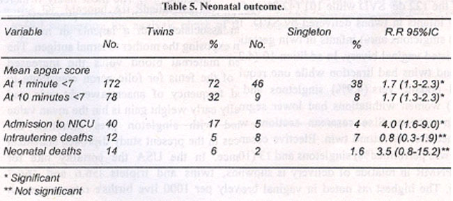 Forty six (37.7%) singletons and 172 (7 1.7%) twins had Apgar score less than 7 at one minute while 9 (7.4%) singletons and 78 (32.5%) twins had Apgar score less than 7 at ten minute after delivery. Two singleton infants and 14 twins died in the neonatal period. In singleton and twin gestations, there were 8 and 12 IUDs respectively. The gross PNMR per 1000 births was 82 for singletons and 108 for twins (the PNMR for the 3760 births in the year 2000 at MCH Centre was 52 per 1000 births). The breakup of presentations for the 120 sets of twins included 139 (57.9%) cephalic, 79 (32.9%) breech while 22 (9.1%) had transverse lie. Among the singletons 116 (95%) had cephalic and 6 (5%) had breech presentation.