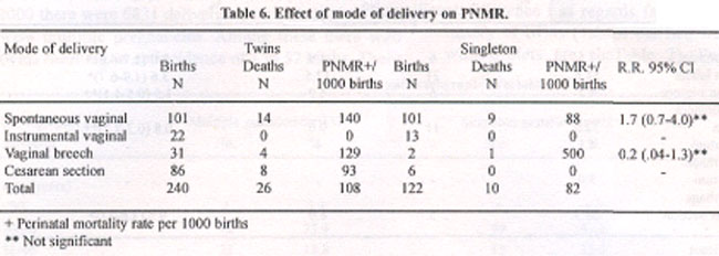 Thirty three singletons and 12 twins had induced labour resulting in labour induction rate of 27% and 10% respectively. Augmentation was required in 17 (14%) singletons and 12 (10%) twins. Among the singletons 101 (82.8%) of the 122 delivered by SVD while 101 (42.8%) of the 240 infants in twin gestations delivered by SVD. Two (1.6 %) singletons and 21(8.7%) infants in twin gestations had assisted vaginal breech delivery, in addition 10 (4.2%) of second twins had breech extraction while one required internal podalic version. Six (4.9%) singletons and 46 (19.2%) women with twin gestations had lower segment cesarean section. Six of these cesarean sections were performed for the retained second twin. Elective cesarean section was performed in 3 (1.6%) singletons and 13(10%) twins. PNMR in relation to mode of delivery is shown in Table 6.