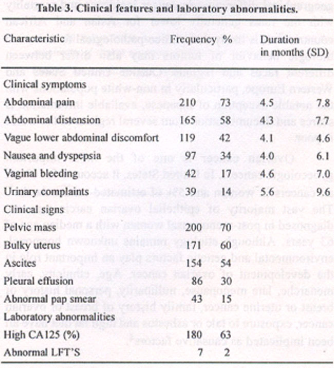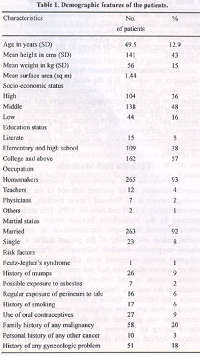 Background:Although geographic and racial differences in the incidence of cancer are well recognized, information regarding any dissimilarity in clinico-pathologica! behavior of cancers is scarce. In particular, information from the developing countries regarding clinico-pathologic features of even some of the common cancers such as ovarian cancer is lacking.
