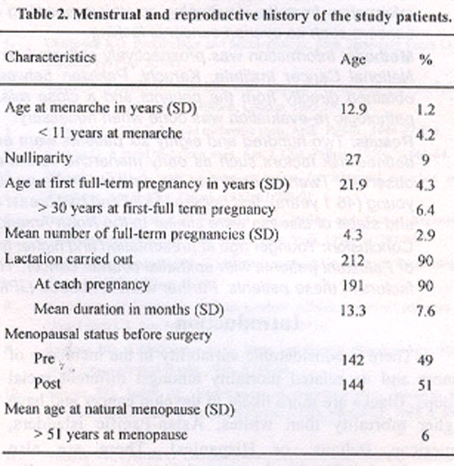 Most belonged to middle or upper socioeconomic class and were well educated. Only a few patients had any of the well defined risk factors (Table 1). One striking difference is the number of patients with family history of cancer (20%). Most of these were ovarian, or breast cancers (90% of cases). Sixty eight percent of the relatives with cancer had first-degree relationship with the patient. Mean age of these relatives was 46.1 ± 10.2 years. Five percent fulfilled the criteria for hereditary ovarian cancer (IIOCS) primarily breast-ovarian syndrome. Ninety two percent were married and only 9% of them were nulliparous. Mean number of pregnancies was 4.3 and most had established lactation (Table 2).