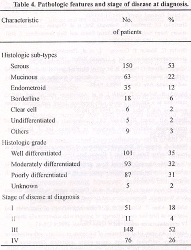 Methods:Information was prospectively collected on all patients with epithella! ovarian cancer referred to the National Cancer Institute, Karachi, Pakistan between January 1,1993 and June 30,1998. Information was obtained directly from the patients and a close relative. Medical records were reviewed and radiologic and pathologic re-evaluation was done when necessary.
