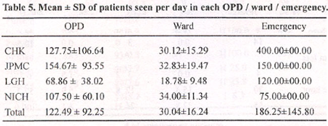 The mean with S.D. of patients seen per day at each OPD was 122.49±92.25 in ward 30.04±16.24 and in emergency was 186.25±145.80 (Table 5).