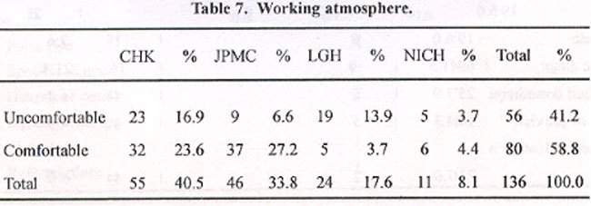 The working atmosphere was comfortable in most (58.8%) of the units (Table 7).