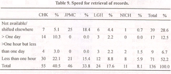 In all the hospitals, the speed for retrieval of records was good. In majority of units (58.8%) records could be obtained within a day (Table 9).