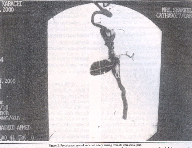A 60 years old housewife sustained head and neck trauma in a road traffic accident, following which she developed neurological symptoms including numbness, weakness and pain in both upper limbs. These symptoms became severe over a period of two months especially on the left side. On examination the muscle power of the left arm was 3/5 and she was unable to move the arm because of pain. MRI of the neck was performed and a diagnosis of cervical disc prolapse was made. She underwent cervical discectomy in April 2000, which was uneventful except for excessive pen-operative bleeding which stopped after applying pressure. Following the operation her neurological symptoms improved but a month and half later she developed difficulty in swallowing and felt pulsation in the throat. The swallowing got worse and reduced to liquids because of the osseous canal which protects it; it can still only. She also noticed a swelling in the left side of the neck, which was labeled as an abscess on ultrasound scan. Patient was taken to the theater for incision and drainage of the abscess. On making the skin incision the swelling was noticeably pulsatile, the skin was closed and arteriogram was performed which revealed a pseudoaneutysm of the vertebral artery arising from its intra-spinal part at the level of C3 - 4 (Figures 1 and 2).