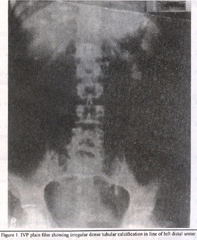 A 55 years old male, known case of genitourinary tuberculosis, presented with fever, abdominal pain and pyuria. On examination he was tender in left lumbar area. Laboratory findings showed increased white cell count of 15,000and increased ESR. Urine analysis revealed frank pus with few red blood cells. Plain film of the abdomen showed irregular dense calcification in the left renal area opposite the transverse processes of L1-L3 vertebral bodies. There was also dense tubular calcification in line of left distal ureter (Figure 1).