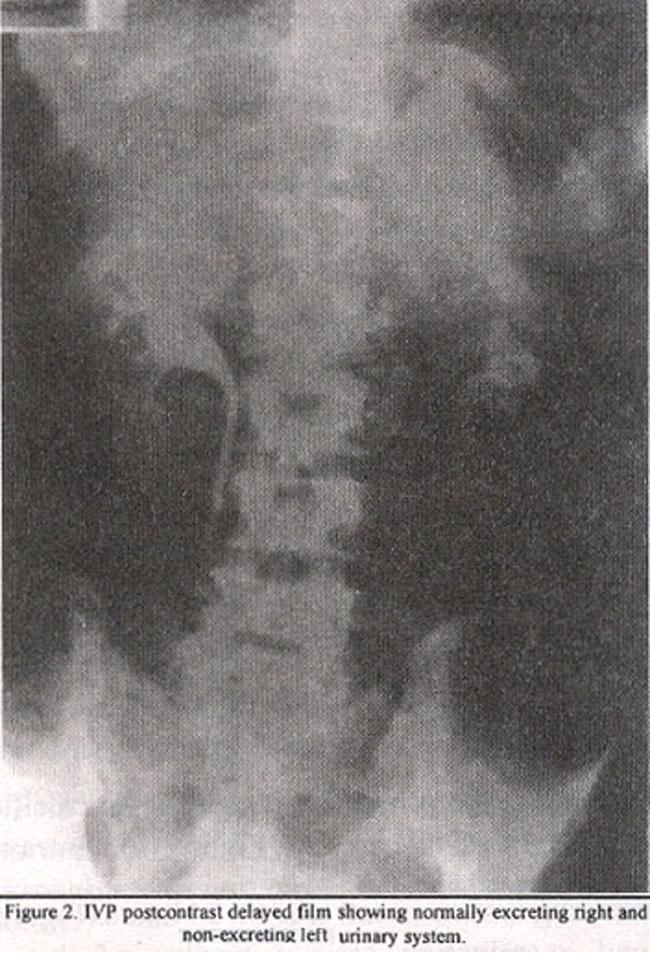 Intravenous pylography showed normally excreting right urinary system with a non-excreting system on left side till 24 hours (Figure