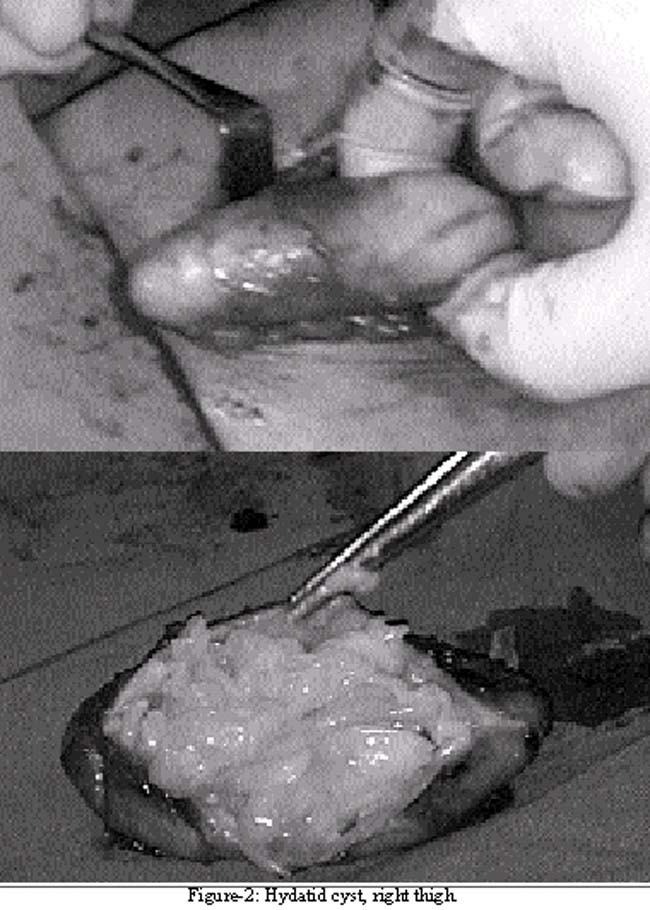 After general anaesthesia, a circumareolar incision was made in the upper inner quadrant of left breast. On attempting enucleation, adhesions of lump with breast tissue were found. During dissection, the hydatid sac was accidently opened and numerous daughter cysts were removed; there was no anaphylactic reaction. The cyst was removed in toto and wound was closed. Femoral hydatid cyst was also excised in toto; it also contained numerous daughter cysts. The post-operative period was uneventful. Histopathology confirmed hydatid cyst disease in both lumps. Abdominal ultrasound, X-ray chest, and CT scans of abdomen and chest were normal. Postoperatively patient was given a 4 weeks course of albendazole. Monthly follow-up during the first year showed gradual decline in hydatid serology. Patient was then followed annually with serology and CT scan of abdomen, chest and skull, and no recurrence was detected at the end of 3 years.