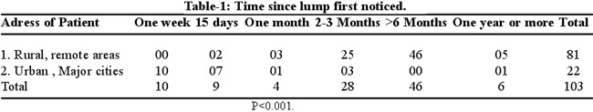 There was a significant difference in terms of duration of symptoms and presentation of the disease between rural and urban population (P<.001) as shown in Table-1.