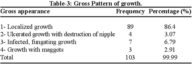 The Fine Needle Aspiration Cytology (FNAC) revealed malignancy in 96 (93.2%) patients while results were inconclusive in 7(6.8%) patients. A proportion of 90.3% were pre-menopausal and multiparous. History of breast feeding was present in majority of the patients. Tumour was detected by the patients themselves in 91(88.34%) patients. Eighty nine (86.40%) patients had a localized lump involving one quadrant while diffuse lump involving the whole breast was present in (14%) patients.