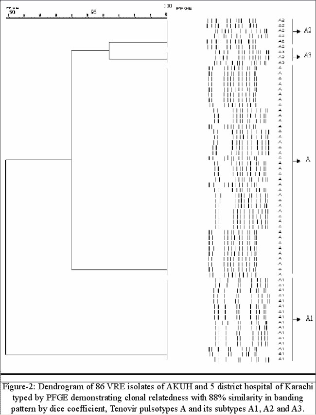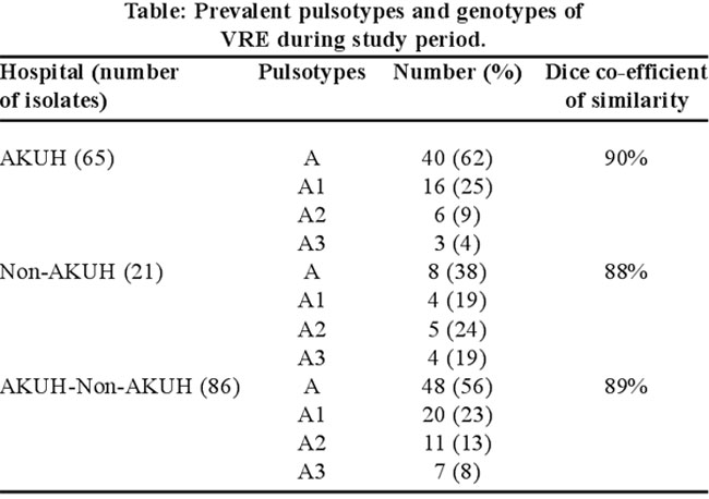Results: Analysis of PFGE data by Tenover scheme showed single major pulsotype A with its subtypes A1, A2 and A3 present among different tertiary hospitals in Karachi. The dice coefficient of similarity among AKUH, non-AKUH and total 86 (AKUH and non-AKUH) had a value of 90%, 88% and 89% reflecting their clonal relatedness. In all 60/65 (92%) and 19/21 (90%) AKUH and non-AKUH isolates had vanA gene respectively. None had vanB gene.