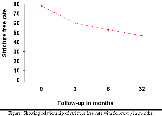 At mean follow-up of 15.8 ± 10.8 months, a total of 31 (40%) patients developed recurrence of stricture at the previous site which was less severe than the original stricture length. These were treated by various methods. Six received a second sitting of Laser Urethrotomy, 4 had Urethroplasty and 21 patients were managed with intermittent dilatation. The relationship of stricture free rate and follow-up in months is shown in Figure.