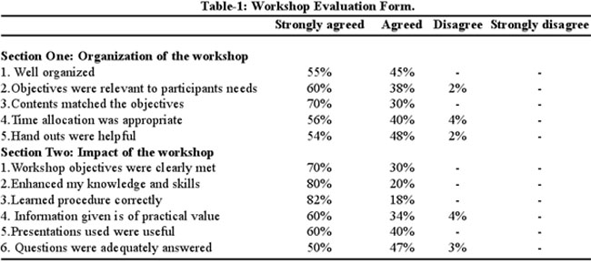 Medical education has undergone major transformation along with the change in concept of health and disease. It is becoming increasingly community oriented, learner-centered, self learning, and self peer assessing process. The traditional education system where the teacher is the sole provider of knowledge and the learner is a passive receiver is now being replaced by a model of structured teaching, training as well as assessment. Literature has also suggested that didactic sessions are less effective than are interactive small group discussions and hands on training in form of workshops, effectiveness of training should then be assessed by obtaining feedback from participants or analysis of pre and post training test.1 This concept of teaching, learning has led us to conduct these workshops which included interactive teaching sessions as well as hands on practice sessions. Effectiveness and evaluation of workshop in terms of improvement in knowledge and skills is objectively assessed by feed back forms, post test and practical demonstration.