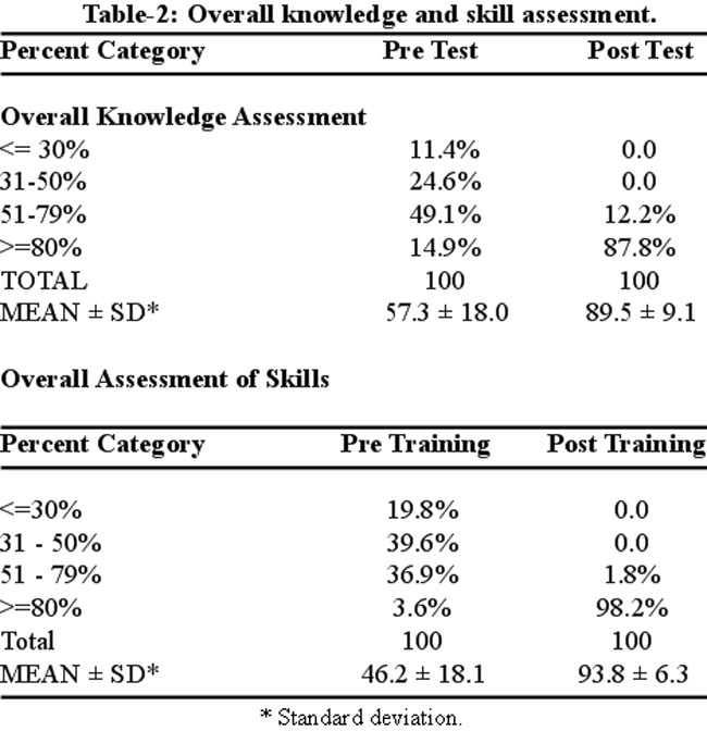 In assessment of skills, results showed that only 3.6% trainees scored >80% in pre training skills performance while in post training assessment 98.2 % scored >80%. Mean score was 46.2 ± 18.1% in pre assessment and 93.8 ± 6.3% in post training assessment (Table-2).