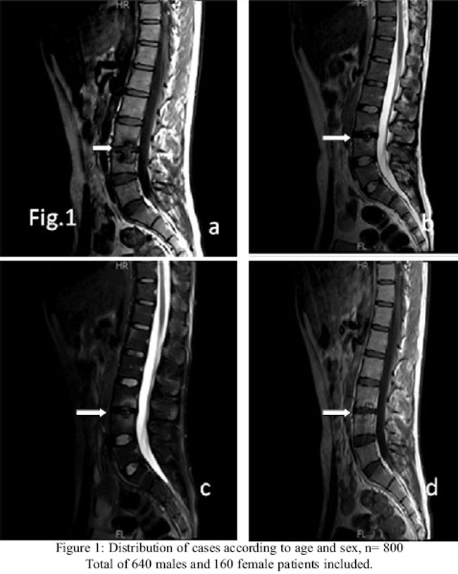 An MRI lumbar spine was done which showed abnormal signal intensity along the end plates of L3 and L4 vertebra with desiccation of intervening disc. Signal intensity was hypointense on T1-and hyperintense on T2 and fat saturation sequences. After administration of intravenous Gadolinium, these showed enhancement, as seen in Figure-1.