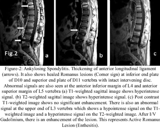 Active Romanus lesion (enthesitis) at L3 vertebra. There was also contrast enhancement at this lesion as seen in Figure-2 a,b,c. Based on these findings, a most probable diagnosis of Spondyloarthropathy most likely Ankylosing Spondylitis was suggested.