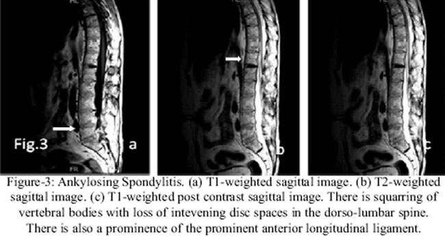 Hence MRI shows different imaging features of AS depending upon the location and extent of the disease process. Familiarity with these features helps in diagnosing Ankylosing Spondylitis and in reaching the correct diagnosis as seen in our case series.