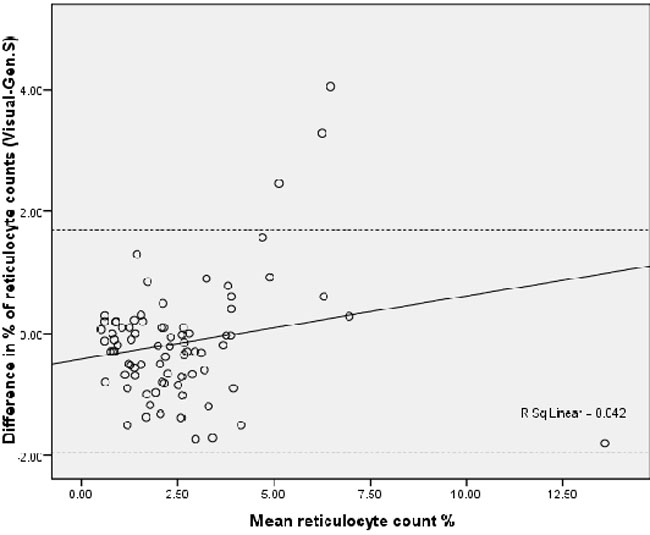 It was observed that the three techniques were positively correlated in lower count as well as at higher reticulocyte counts with statistically significant results. Coulter® STKS gave 5 unreliable high counts compared to other two techniques. Our study did not address specifically the cause of this discrepancy, but it is well known that interference factors like nucleated red cells, Howell Jolly bodies, or other red cell inclusions as well as haemoglobinopathies or high white cell count can result in such erroneous results.8,23 It has been suggested that such implausible results should be counterchecked through differential counts and or manual reticulocyte counting.24 The results analyzed through the three techniques showed good agreement as majority of results lie within 95% limits of confidence interval. It was also generally observed that such correlations became weak with the increase in difference in measurements. Also, reticulocyte analysis by STKS was consistently higher compared to results by visual and Gen.S.
