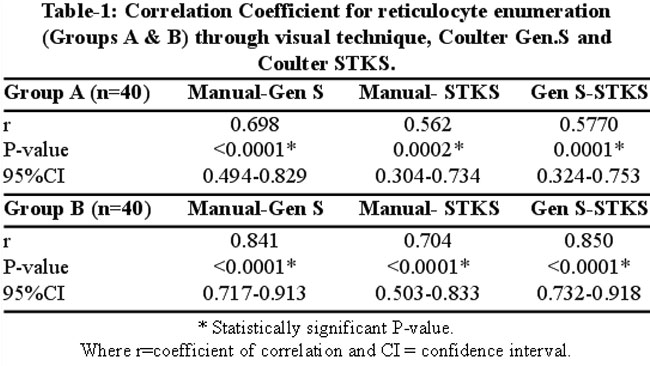 The results of reticulocyte estimation obtained by 3 modes were correlated using Pearson's correlation coefficient (r). These were computed as 0.884 (p=0.000), 0.875, (p=0.000) and 0.793 (p=0.000) for manual-Gen.S, Gen.S-STKS and manual-STKS respectively thus showing positive association of these results. Group A (reticulocyte count <2.0 %) and group B (reticulocyte count >2.1%) also showed similar linear association for the reticulocyte estimations by the three techniques (Table-1).
