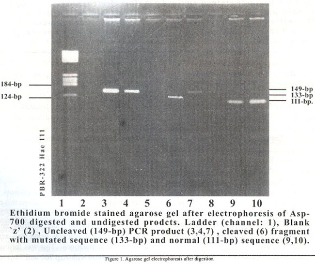 Restriction enzymes Asp-700 and Taqi were purchased from Boehringer, Mannheim, FRG. Amplified PCR product (20 micro liter) was digested overnight with respective restriction enzymes i.e, Asp-700 at 37°C for S mutation and Taq 1 at 65°C for Z mutation. After 14-16 hours, 10 more units of the enzyme were added and the digestion was continued for another 2 hours. The digested and the undigested products were analyzed on a 3% agarose gel after staining with ethidium bromide. The size marker was 4X174 Hae Ill digest, supplied by Sigma, USA.