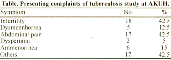 A total of 40 cases of genital TB were reported at the AKUH during twelve-year period. Majority of cases (75%) were between 20-45 years. Two cases were discovered in women who were in their seventies and both died from other medical problems apart from genital TB. The clinical presentation of genital tuberculosis was very variable. The commonest presenting symptoms were infertility in 18 cases (42 .5%) of which it was primary in 78% and secondary in 22% cases. Seventeen (42%) of cases presented with abdominated pain. Other less frequent presenting symptoms included fever, ascites, irregular vaginal bleeding, oligomenorrhea, chest pain and pain in the flanks (Table).
