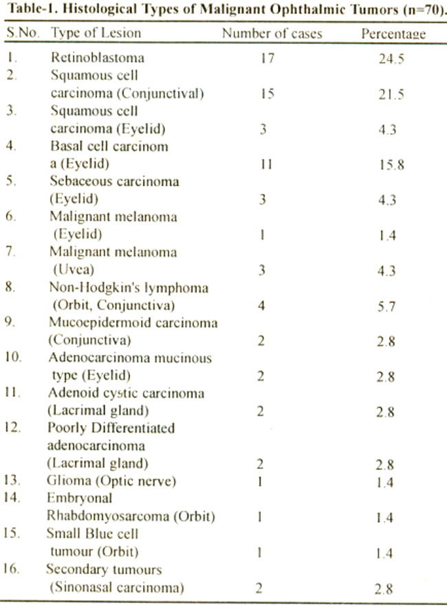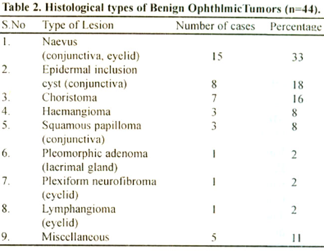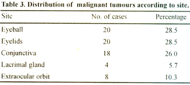 Of the70 malignant ophthalmic tumours, 38 (54%) were in males and 32 (46%) in females. (male to female ratio 1.18:1). Of the benign ophthalmic tumours (n=44), 32 were seen in males and 1 2 in females, (male to female ratio 2.7:1).