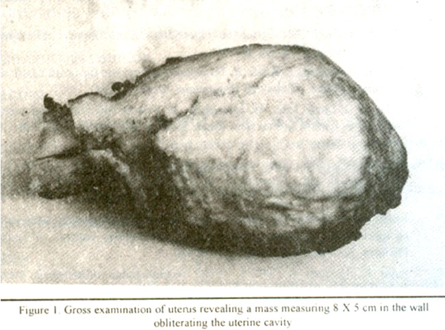 The uterus on gross examination revealed a mass measuring 8 x 5 cm in the wall which was obliterating the uterine cavity.
