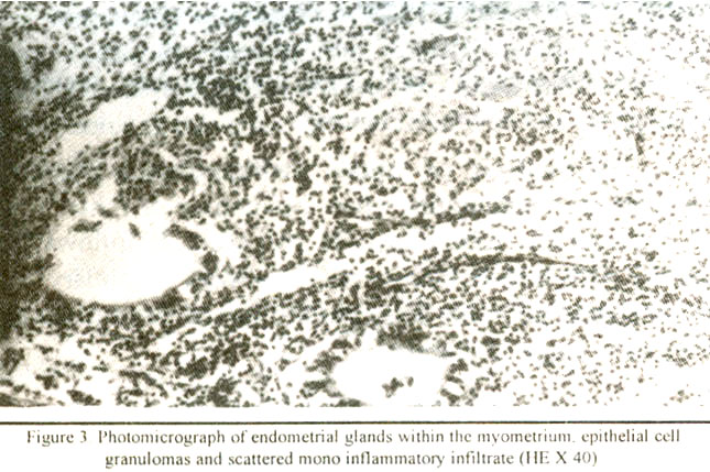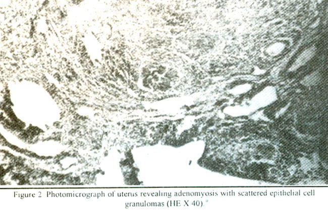 Adenomyosis refers to the presence of islands of endometrial glands and stroma within the myometrium. The glands may even reach the serosal surface of the uterus. Benson Smeeden established the criterian for adenomyosis that the endometrial glands should extend at least two low power fields into the myometrium1. It occurs in 8% to 27% of patients and is usually encountered in women over 35 years age. Adenomyosis results in an enlarged and globular uterus because of myometrial hypertrophy. The diagnosis may be suspected on cut sections in the presence of depressed small cystic lesions in obvious but ill defined zones of muscle hypertrophy2.