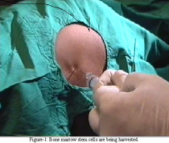 Methods: This procedure was carried out during a pilot study which was conducted in the department of interventional cardiology of Armed Forces Institute of Cardiology/National Institute of Heart Diseases Rawalpindi from June 2004 to November 2006. The inclusion criteria\'s were recent anterior myocardial infarction with anteroapical hypokinesia and single vessel disease in left anterior descending artery. The informed consent was obtained. After giving local anaesthesia and light sedation, both posterior superior iliac crests were accessed by multiple punctures to get stem cell harvest. The harvest was analyzed to document total and mean mononuclear cell count. An over the wire balloon catheter was parked in mid left anterior descending artery. The stem cells were injected intermittently into the infarcted myocardium during transient balloon inflation over 45-60 minutes.