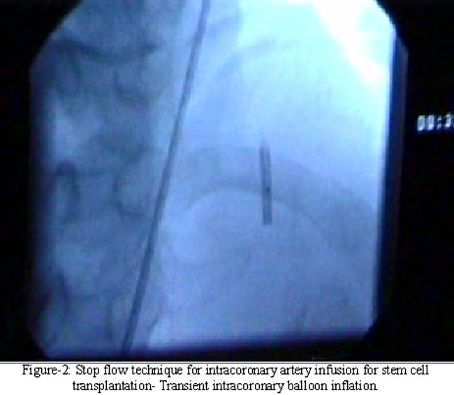 was used to deliver stem cell harvest into the damaged myocardium. During this technique the balloon was inflated intermittently (Up to six times, lasting for three minutes) at low pressure. About 40-50 milliliters of stem cell harvest was slowly injected during low pressure balloon inflations of the short over-the-wire balloon catheter (2 ×10 mm with central lumen, Sprinter- Medtronics) which was placed in mid left anterior descending artery above the border zone of the infarction. To maximize contact time of bone marrow cells with the microcirculation of the infarct-related artery, the balloon remained inflated for 3 minutes. It takes about 45-60 minutes to complete the procedure.